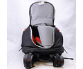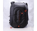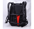 Se puede usar un bolsillo desmontable y correas en el lateral y la parte delantera de la bolsa para sujetar un trípode o un monopié.Los divisores flexibles tienen la opción de doblarse fuera del camino cuando sea necesario, o de ser retirados para proteger su equipo.Se incluye un protector contra la lluvia para ayudar a mantener el equipo seco. Un lado es plateado para desviar la luz solar directa y ayudar a evitar que su equipo se sobrecaliente.Una funda en la parte posterior de la mochila se desliza sobre el asa de un carrito para que puedas tirar de la mochila junto con tu equipaje.Una correa de esternón y un cinturón proporcionan soporte adicional para cargas pesadas.Las correas para los hombros se guardan en un compartimento en la parte posterior de la bolsa para facilitar su uso con un asa de carro.Un revestimiento especialmente aplicado a la tela mantiene la bolsa resistente a la humedad.